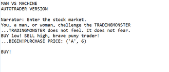 MAN VS MACHINE: AUTOTRADER VERSION is usually not the role playing game any one would want to play. This game simulates real-life situations that happen every day on trading floors. You are a trader starting with $10. The autotrader starts with $100 and never misses a good deal. The rules are simple: BUY and SELL and you bankrupt the autotrader or the autotrader takes your innings. Like the real world, the more $wealth you amassed, the easier it is to bankrupt others. The only way to bankrupt the AUTOTRADER in this game is by taking over the market through amassing sufficient $wealth in the market.